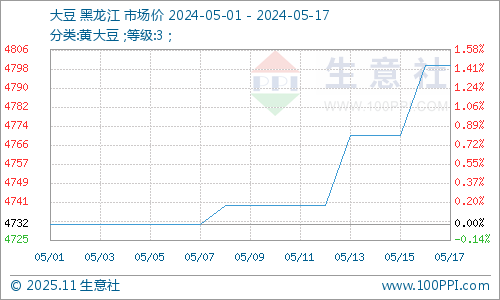据生意社商品行情分析系统显示:5月开始,国产大豆行情整体陆续回暖,行情振荡上涨。5月1日,国产大豆市场均价4732元/吨,5月17日,国产大豆市场均价4800元/吨,价格上涨1.44%。